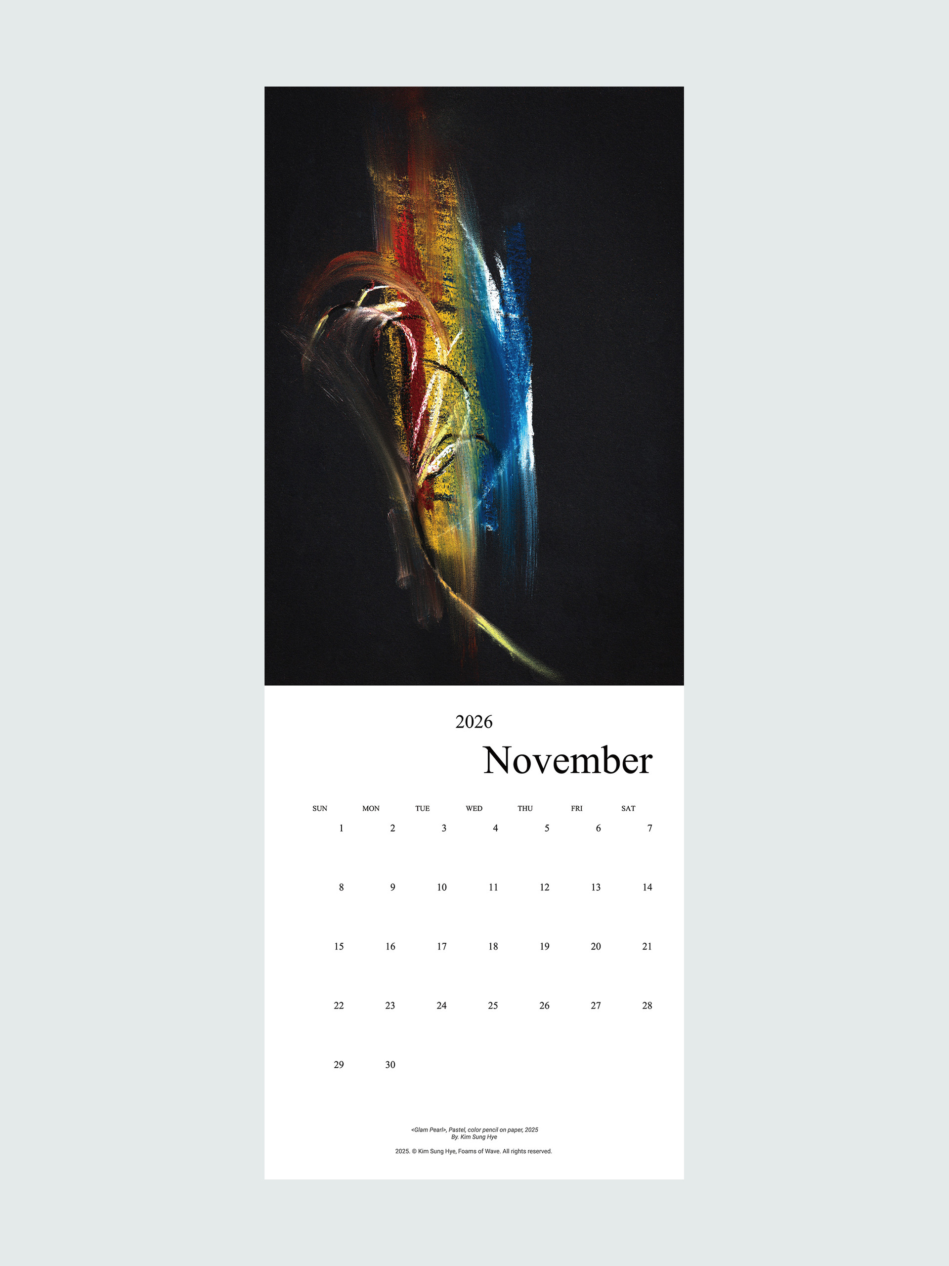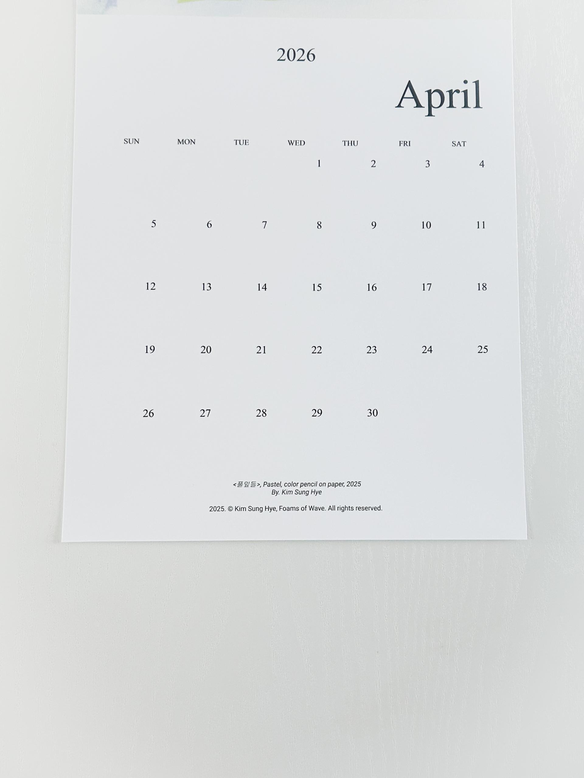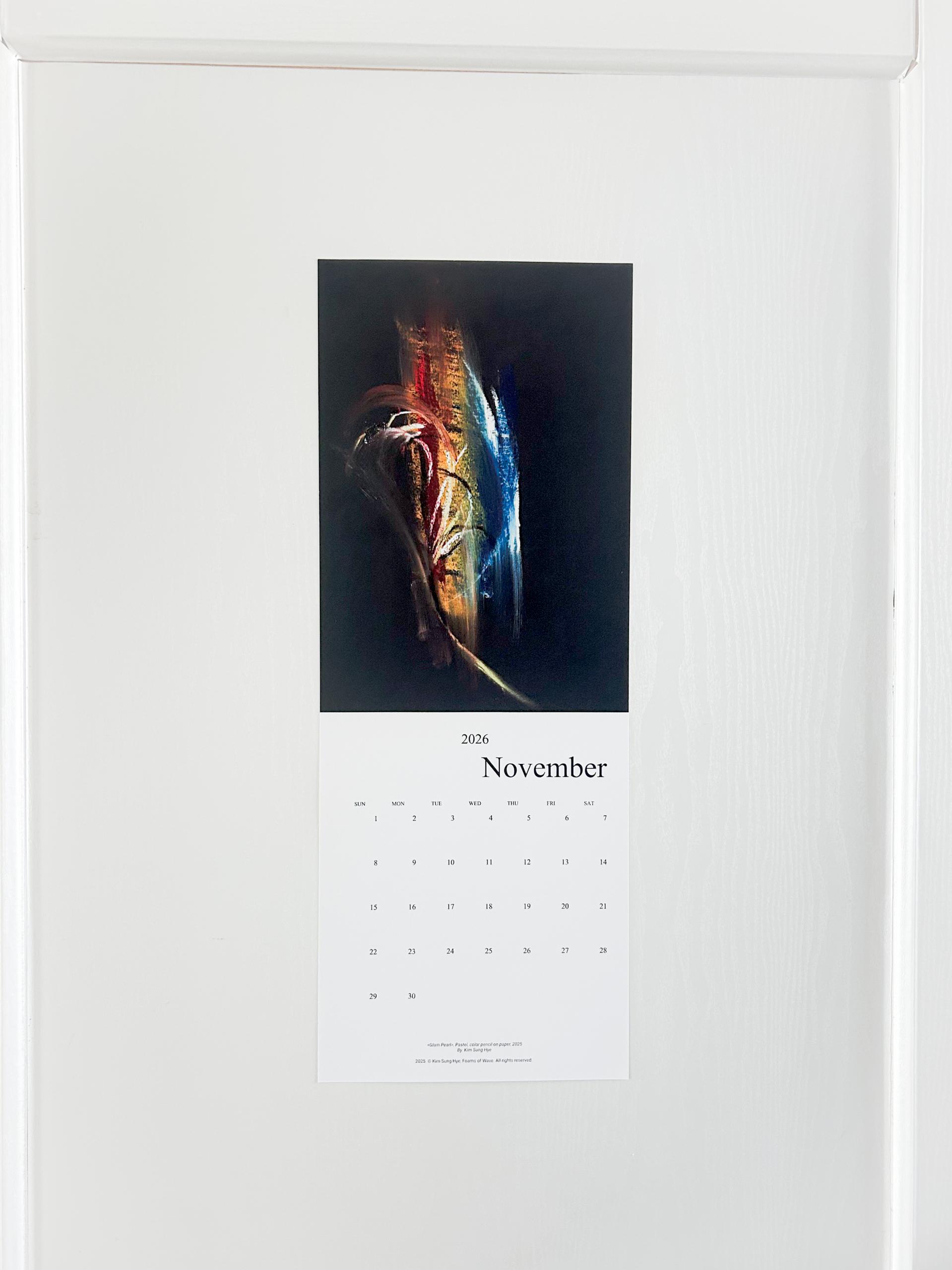 파도의 거품들의 2026 캘린더는 '사전 주문 - 후제작' 방식으로 제작됩니다. 무제본 낱장 구성으로 핀, 압정, 테이프 등으로 고정이 가능합니다. 벽에 걸 때에 용의하도록 사무용 클립을 증정합니다.