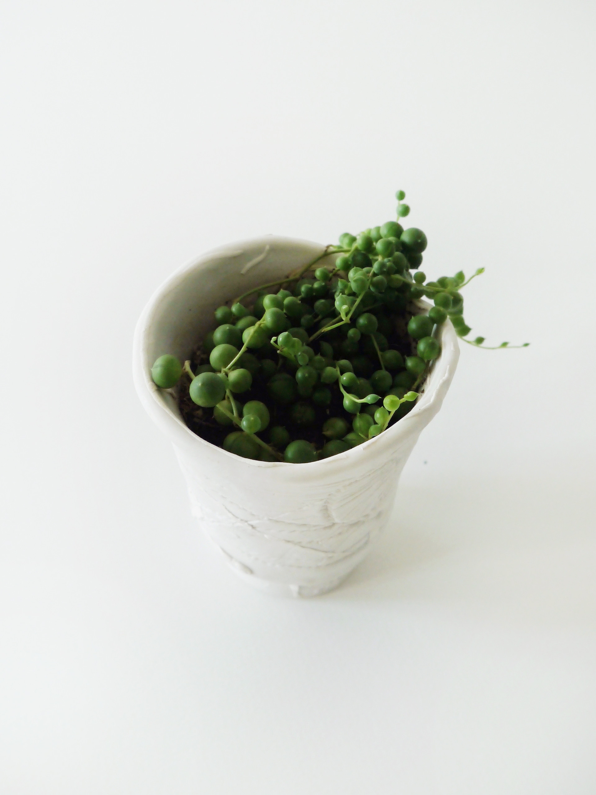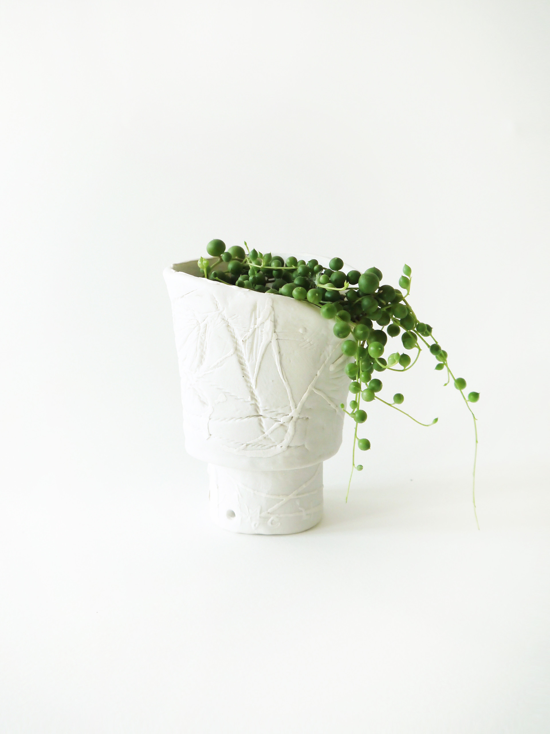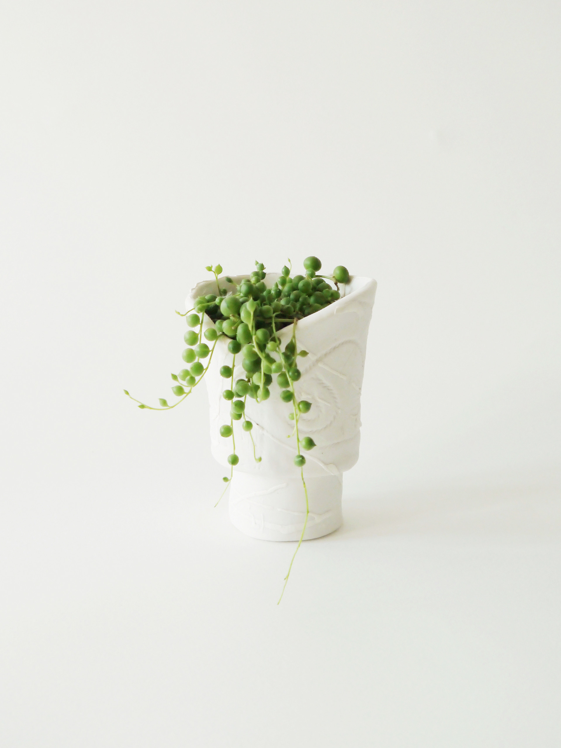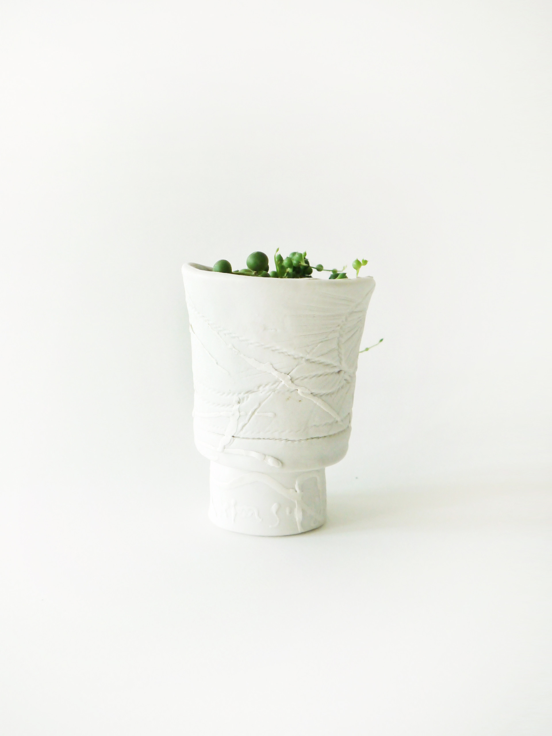 마치 중세시대 어디쯤의 시공간에서, 왕좌를 다투는 이들의 포도주가 담겼을 법한 잔을 닮은 모양의 화기입니다. 화이트 톤으로만 이루어졌으나 코팅되지 않은 표면에 새겨진 나선의 텍스쳐가 돋보입니다.